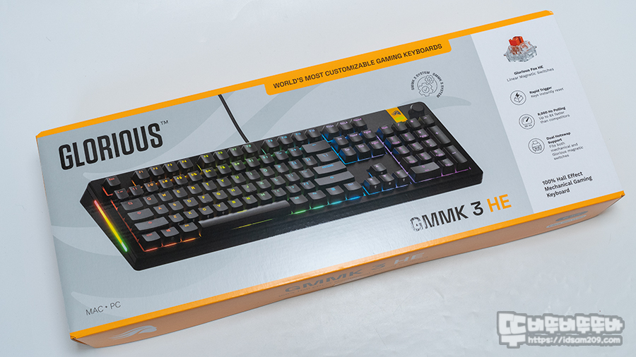 글로리어스 Glorious GMMK 3 HE 100% Prebuilt 키보드 패키지는 제품의 이미지와 HE 자석축 스위치, 래피드 트리거, 8,000Hz 폴링 레이트, 자석축과 기계식 스위치의 듀얼 핫스왑 지원을 표현하고 있습니다.