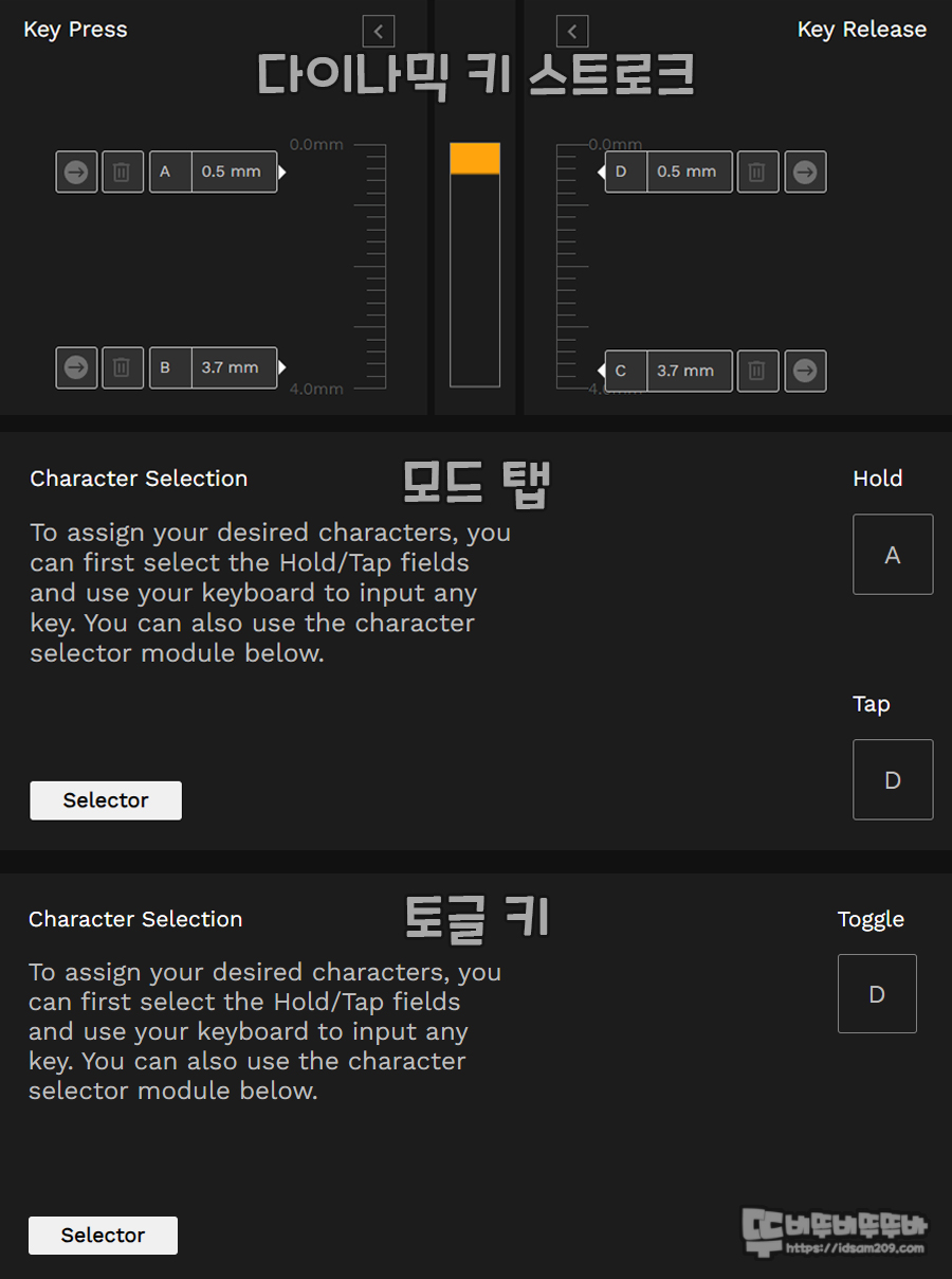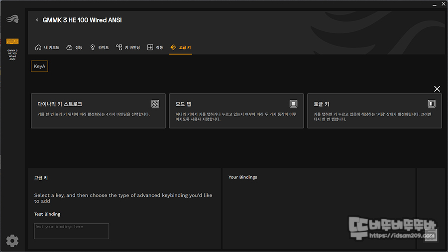 고급 키 메뉴에서 자판에서 기능을 부여하고자 하는 키를 선택 시 다이나믹 키 스트로크, 모드 탭, 토글 키 3가지를 선택할 수 있는 옵션이 나타나는데요.