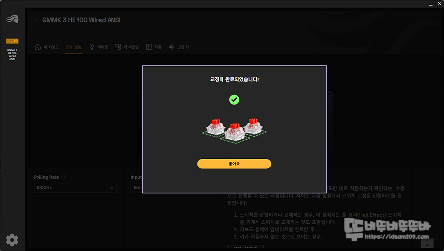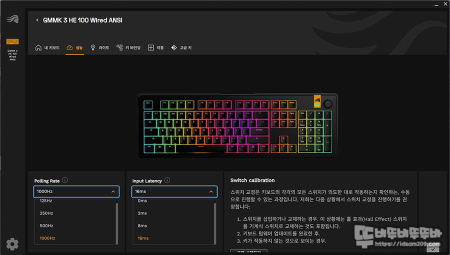 입력 레이턴시는 0 / 2 / 8 / 16ms 속도를 선택할 수 있으며 스위치 교체 시 교정을 지원하는 캘리브레이션은 스위치 교체 후 자동으로 점검하는 기능으로 활용할 수 있습니다.