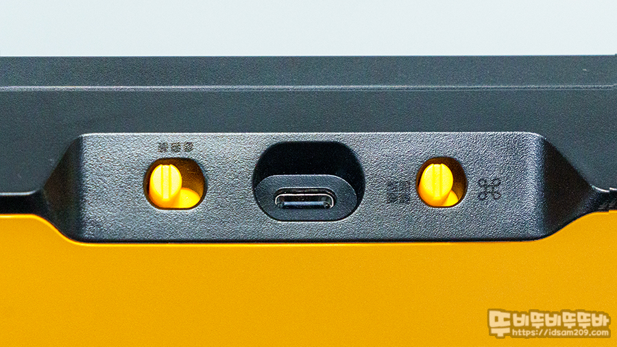 USB-C 단자가 있는 하우징 중앙에는 Win OS와 Mac OS, 프로파일 1, 2, 3을 선택할 수 있는 스위치가 있어 소프트웨어가 아닌 즉각적인 버튼으로 프로파일을 선택할 수 있어 좋았습니다.