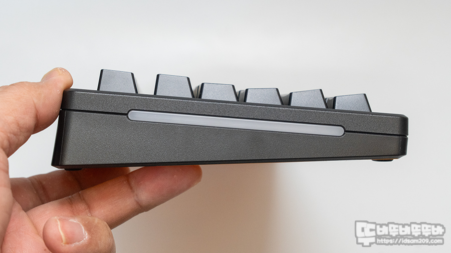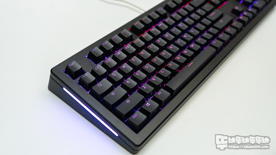 자체 경사로 디자인된 키보드 양쪽 측면에는 LED 라이팅 바가 적용되어 자판쪽에 사이드 라이팅 바 LED 표현을 선택할 수 있으며 Caps Lock 키를 사용하는 경우 사이드 LED 라이팅 바가 점멸하면서 기능이 사용되고 있음을 시각적으로 표현합니다.