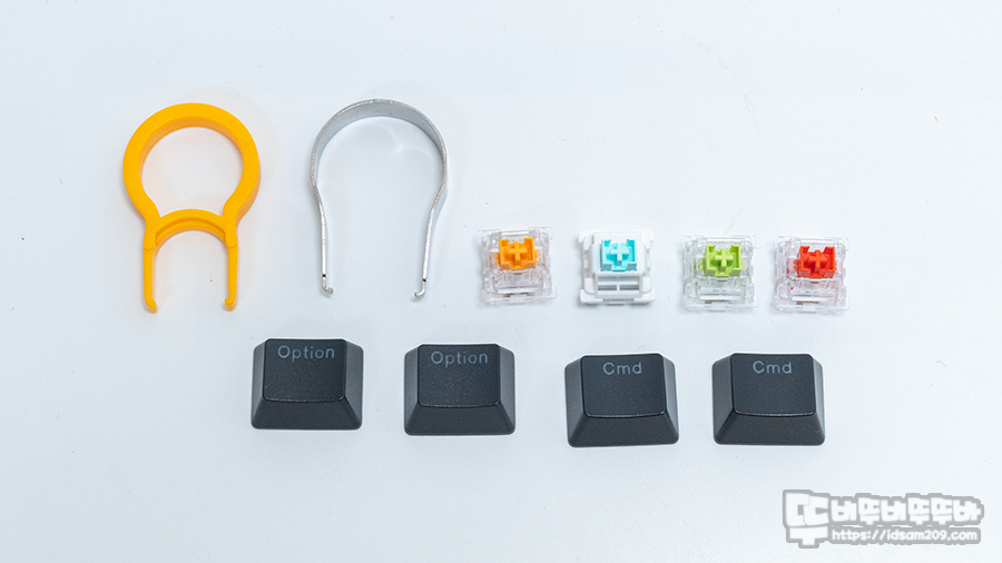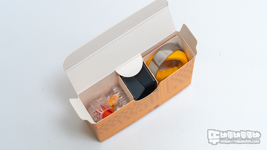 먼저 왼쪽 포켓에 조그만 박스를 오픈하면 샘플용 HE 스위치, MAC 용 Option, CMD 키캡, 스위치 리무버가 들어있고요.