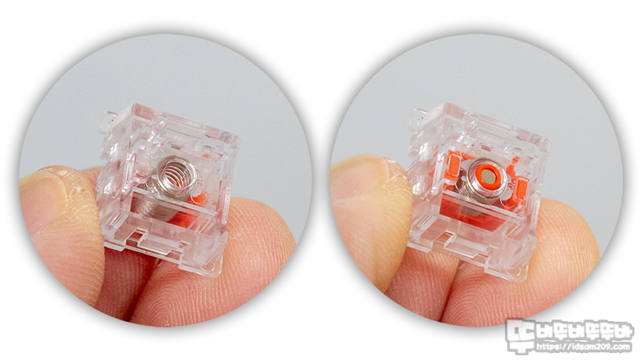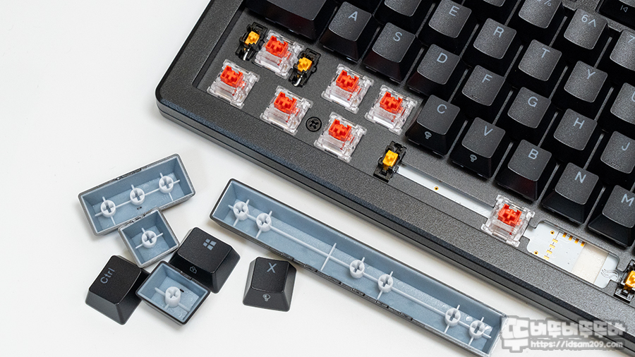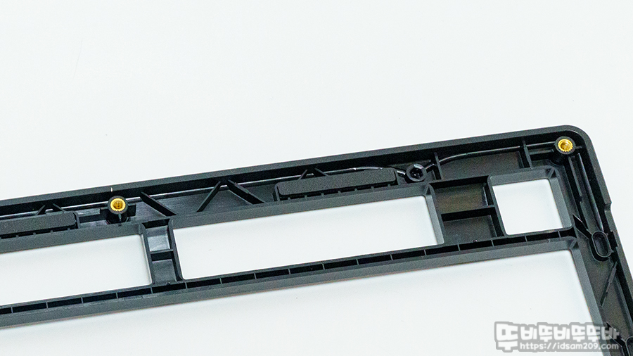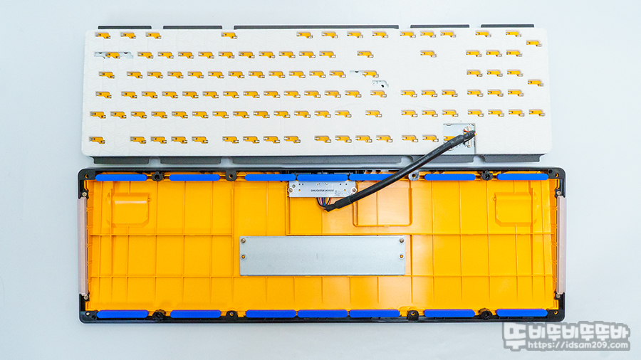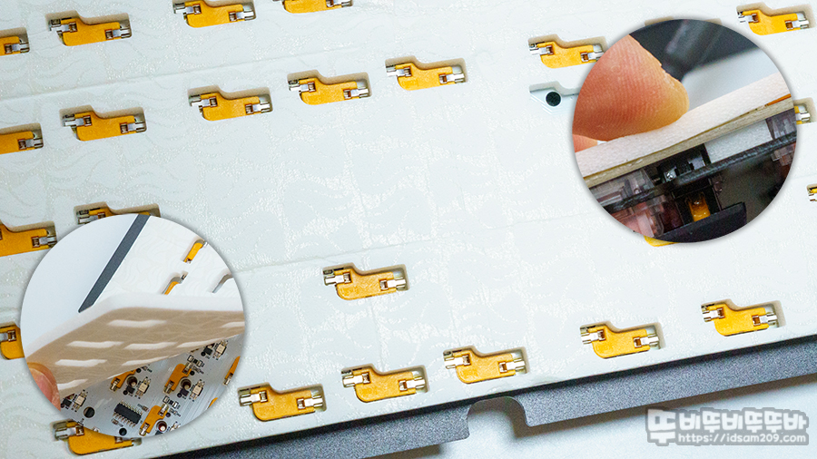 독특한 부분이라면 보강판에 실리콘 캡형태로 적용되는 가스켓 방식이 아닌 상판과 하판에 부착된 실리콘이 보강판을 눌러주는 가스켓 방식을 사용하고 있습니다.