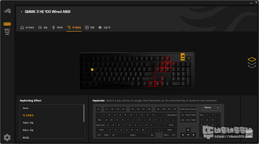 키 바인딩 메뉴는 키 기능을 부여하는 메뉴로 키 맵핑이나 멀티미디어 기능, 마우스 기능, 매크로 등 기본 키보드 기능 이외로 사용자가 원하는 기능을 부여할 수 있는데요.