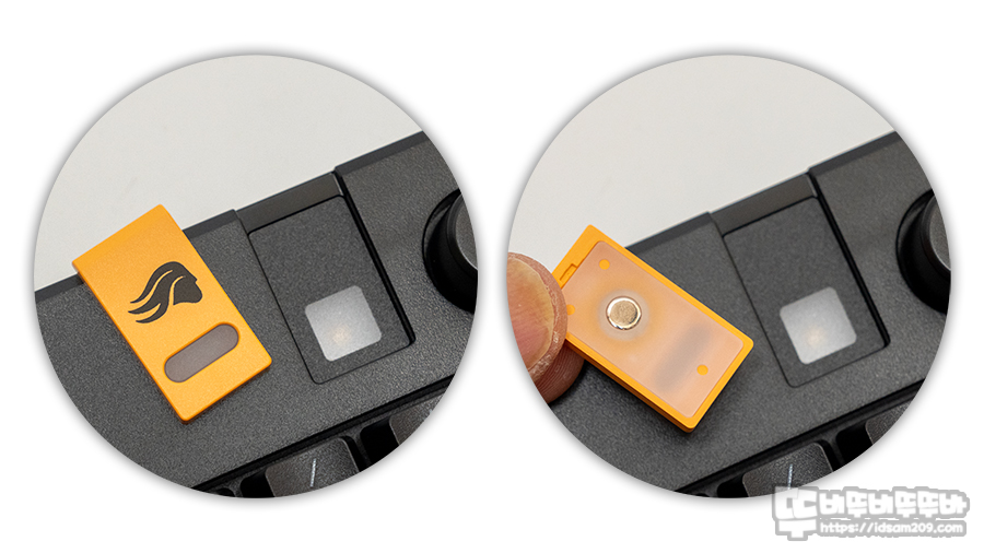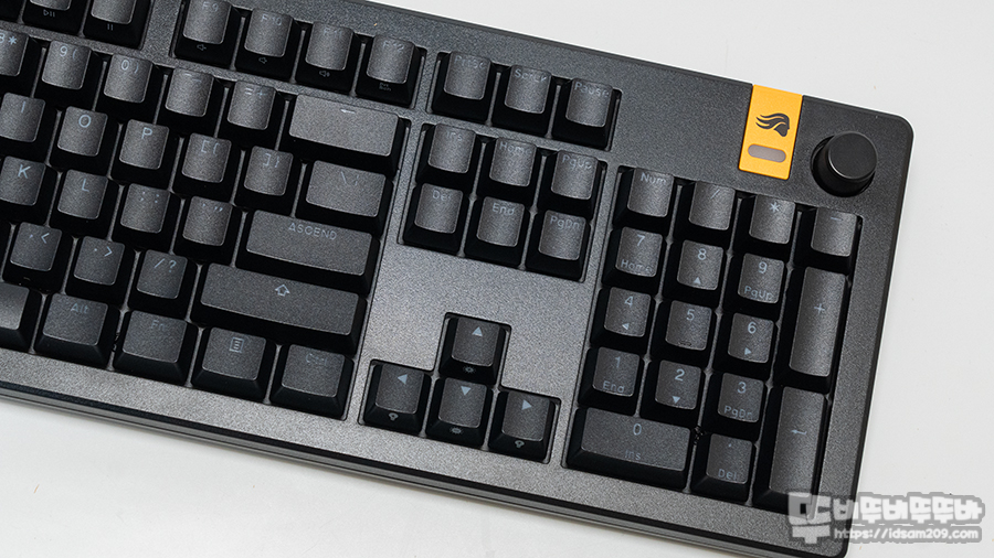 알루미늄 소재가 적용된 GMMK 3 PRO HE와 차이점이라면 F12 키와 노브 사이에 탈부착이 가능한 Gold 컬러 포인트 배지의 소재가 플라스틱 소재가 사용된 점이 눈에 띄네요.