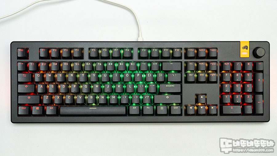 글로리어스 Glorious GMMK 3 PRO HE 100%는 104 키 배열에 볼륨 노브가 적용된 디자인으로 기존의 컴팩트 디자인에서 확장된 느낌을 줍니다.