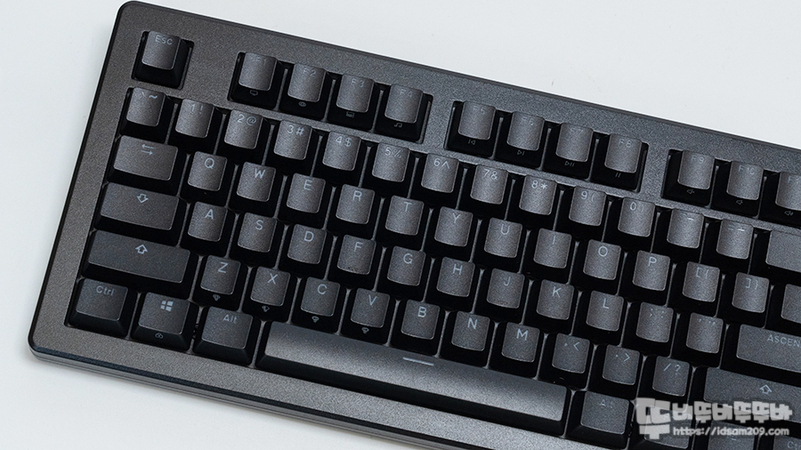 제품에 적용된 키캡은 PBT 이중사출에 OEM 프로파일이 적용되었으며 각인 부분인 반투명 느낌이라 LED Off 상태에서 각인이 생각보다 눈에 띄지 않지만 LED 빛 투과에 특화되었으며 Fn 조합으로 사용되는 키는 측각 실크인쇄로 표현하고 있습니다.