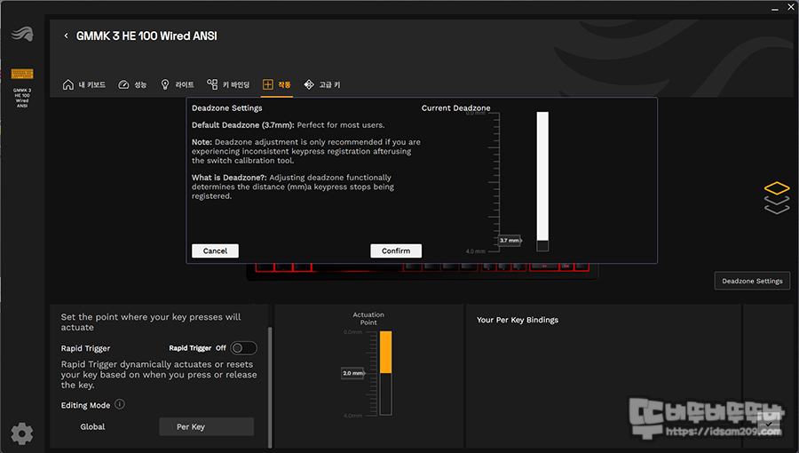 오른쪽에 데드존 설정 메뉴를 누르면 설정된 높이 이하에서 작동하는 않는 리미트를 설정하는 기능으로 제조사에서는 3.7mm가 유저들에게 최적화된 값이라 설명하니 참고하시기 바랍니다.