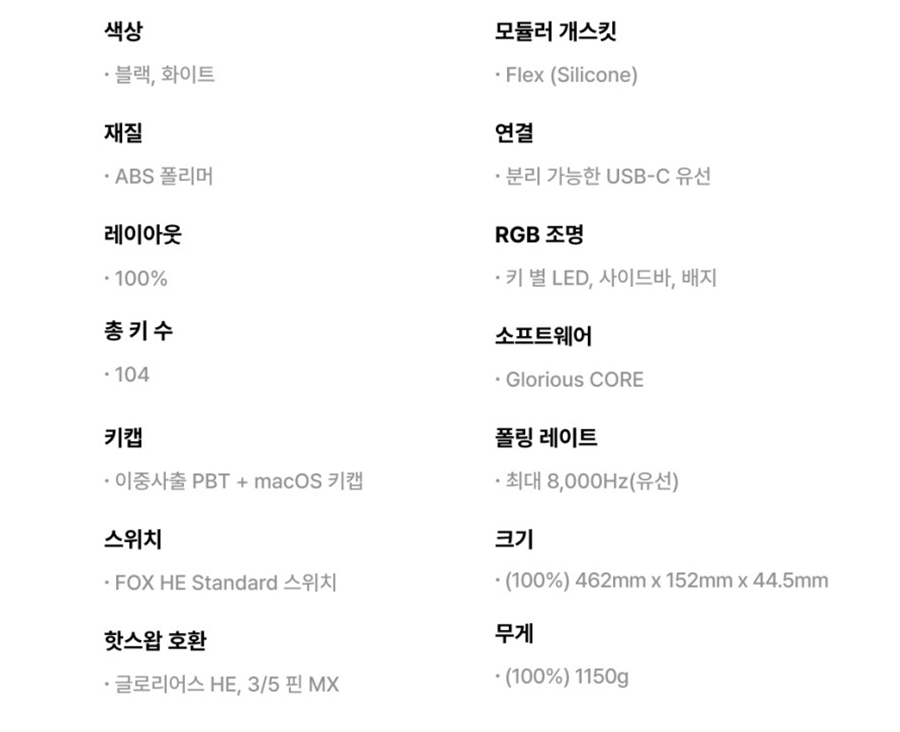 104 풀배열, 이중사출 PBT 키캡, FOX HE 스탠다드 스위치, 자석축/기계식 혼용 PCB, 가스킷 방식, 8,000Hz 폴링 레이트 지원 등의 정보를 확인할 수 있습니다.