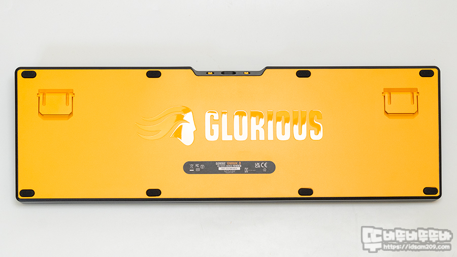 글로리어스 GMMK3 HE 100% Prebuilt 커스텀 래피드 트리거 유선 게이밍 키보드 하판은 옐로우 컬러가 사용되어 브랜드 로고는 유광으로 표현되고 있습니다.