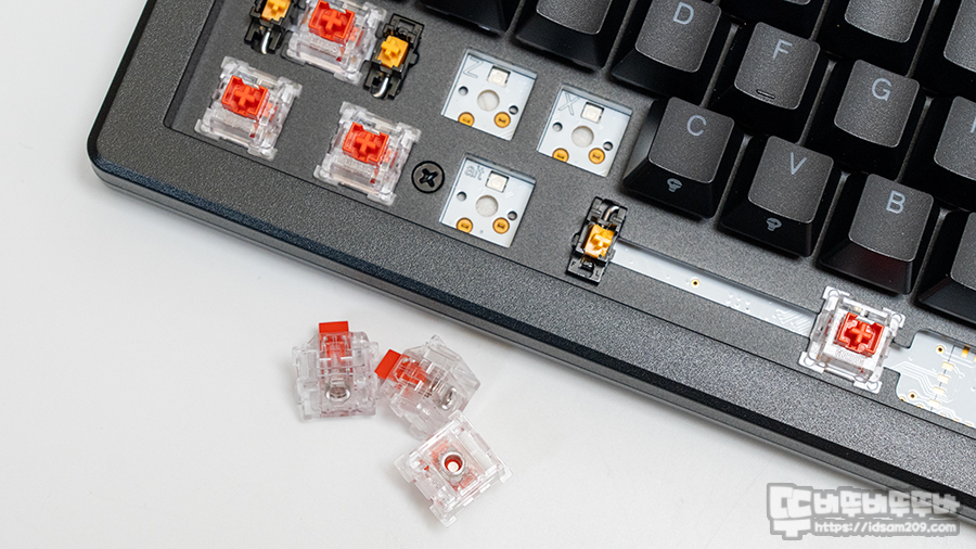독특한 부분이라면 보강판에 실리콘 캡형태로 적용되는 가스켓 방식이 아닌 상판과 하판에 부착된 실리콘이 보강판을 눌러주는 가스켓 방식을 사용하고 있습니다.