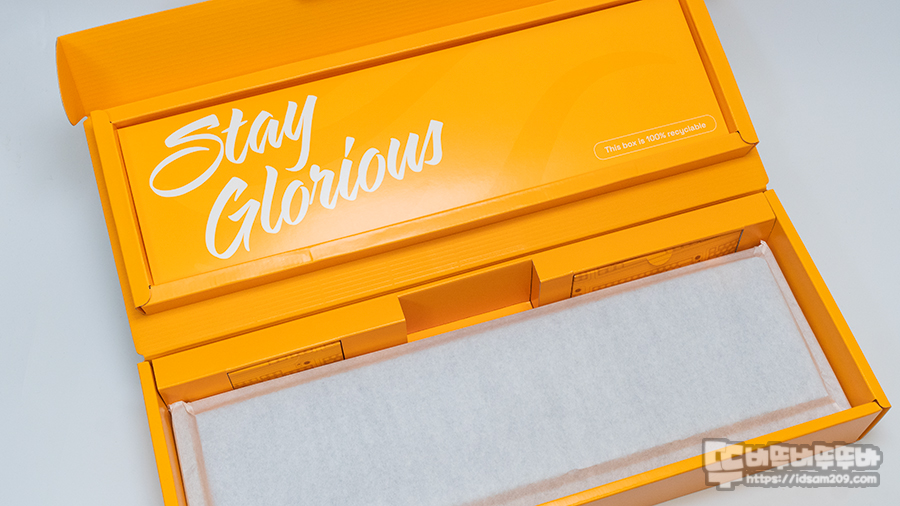 글로리어스 로고가 인쇄된 흠읍재는 기보강과 기판과 하판 사이에 동일한 사이즈가 적용된 듯 보이며 두툼한 두께만큼 통울림 없는 안정적인 타이핑 소음을 들려주었습니다.