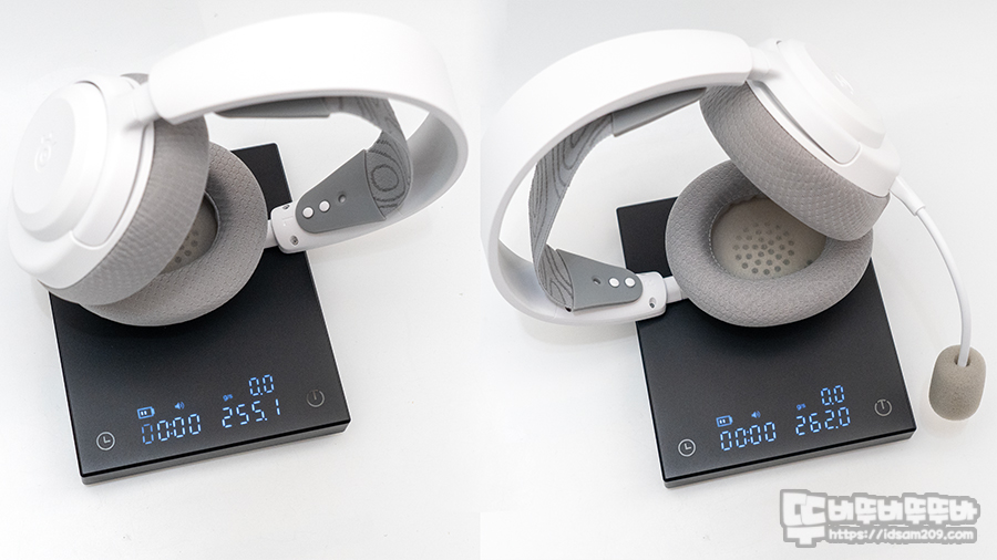 마이크가 없는 스틸시리즈 Arctis Nova 3X 화이트 무선 헤드셋의 무게는 약 255.1g, 마이크 장착 시 약 262g으로 상당히 가벼우며 장시간 헤드셋을 착용해도 귀를 누르는 장력이 없어 편안하게 착용할 수 있습니다.