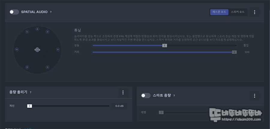 기본적으로 사운드 볼륨과 마이크 측음 그리고 공장 초기화 설정 등이 가능하며 가장 큰 특징은 다양한 프리셋을 실시간으로 적용할 수 있다는 점입니다.
