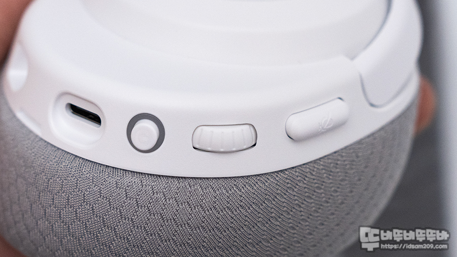 아래쪽에는 USB-C 충전단자, 전원 버튼과 LED 인디케이터, 구분감이 있는 휠 다이얼 및 휠 버튼, 그리고 마이크 On/Off 버튼으로 구성되어 있는데요.