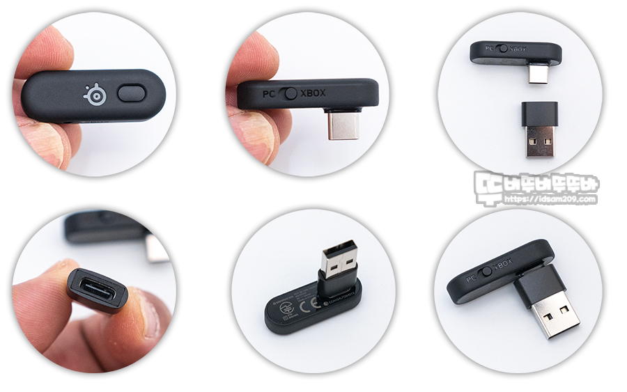 XBOX으로 판매되는 3X 모델의 경우 2.4GHz 리시버 측면에 PC/XBOX 전환 스위치 그리고 스틸시리즈 로고가 인쇄된 전면에 페어링 버튼이 있어 다양한 모바일, 콘솔 게임기, PC에서 사용이 가능한데요.