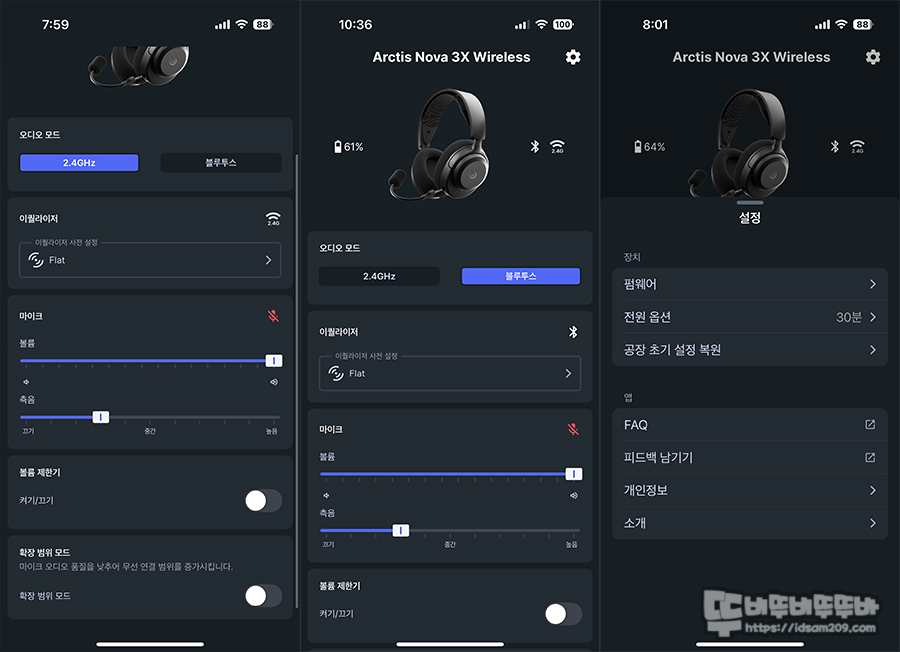 기존의 제품들은 블루투스 연결이 되더라도 프리셋 적용이 안 되는 불편함이 있지만 스틸시리즈 Arctis Nova 3X는 모바일 기기나 콘솔 게임기 사용 시 프리셋 적용으로 사운드 튜닝이 가능한 장점이 있으니 잘 활용하시기 바랍니다.