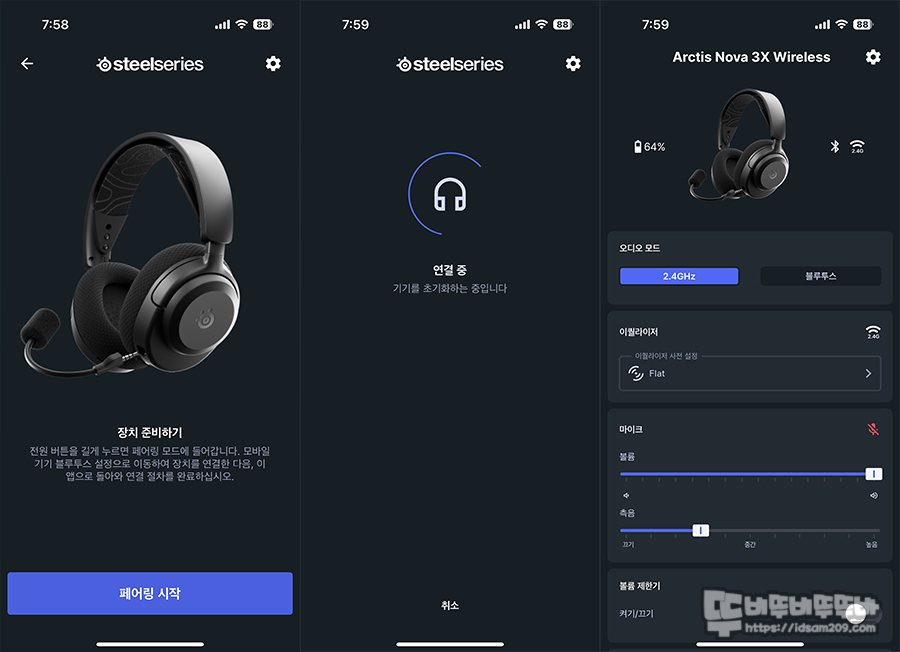 스마트폰으로 사용할 수 있는 앱을 사용할 수 있는 스틸시리즈 Arctis Nova 3X를 블루투스 연결 후 다양한 설정이 가능한데요.