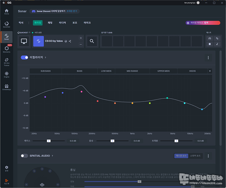 사운드 부분은 기본 EQ 설정이 Flat으로 되어있지만 고음이 선명하지만 중저음이 살짝 느껴지는 사운드라 보통의 게이밍 헤드셋 사운드와 비슷한 부분이기도 하지만 차이점이 있다면 EQ 설정이 다이나믹하게 먹힌다는 점이네요.