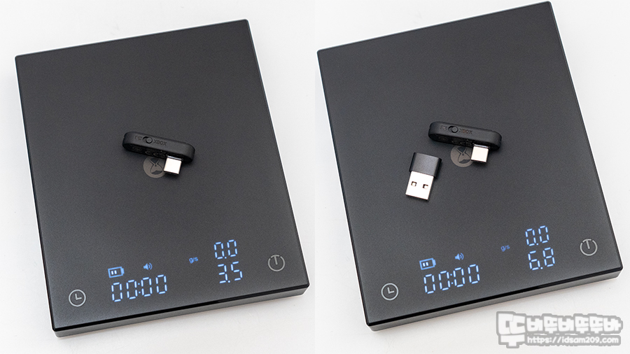 무선 리시버 자체 무게는 3.5g, 변환 아답터 포함 시 약 6.8g으로 어느 기기에 부착하더라도 무게감이 없어 사용하게 편할 거 같네요.