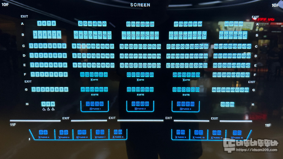 좌석 배치를 보시면 아시겠지만 스크린 크기에 맞춰 좌우로 넓게 배치된 좌석 구조는 솔직히 중앙을 기준으로 E열 이후에서 봐야 스크린을 최적으로 영화를 관람할 수 있는 구조이기에 좌우 사이드에서 영화를 보게 된다면 스크린을 비뚤게 보는 느낌이라 영화의 감동이 감소하는 다소 애매할 수 있습니다.