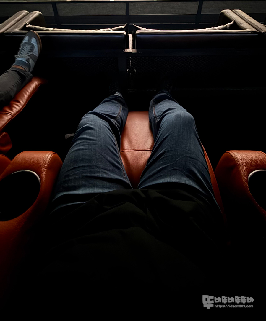그래서 리클라이너 좌석을 활용하여 다리도 펴고, 목 받침대로 앞으로 당겨서 거의 누워서 영화를 관람했다는......