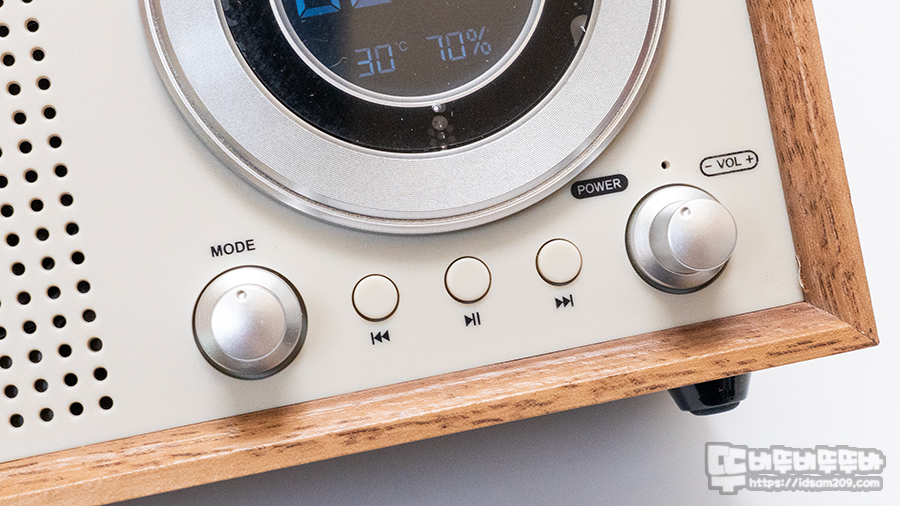 전면에 타공면과 동글동글한 원형 디스플레이와 노브 그리고 버튼 구조는 과거 아날로그 디자인을 현대적으로 잘 복원한 느낌을 줍니다.