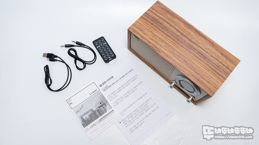 BA-HMK31 Plus 블루투스 스피커는 가로 259mm, 높이 120mm, 앞뒤 폭 135mm로 사이즈로 MDF 인클로저에 우드 스킨이 적용된 오크 나무 디자인으로 레트로 느낌을 잘 살리고 있는데요.