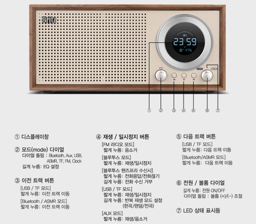 - 왼쪽 노브 : 짧게 눌러 모드(블루투스, TF, USB, FM 라디오, 시계, AUX) 변환, 길게 눌러 6단계 EQ 변환.