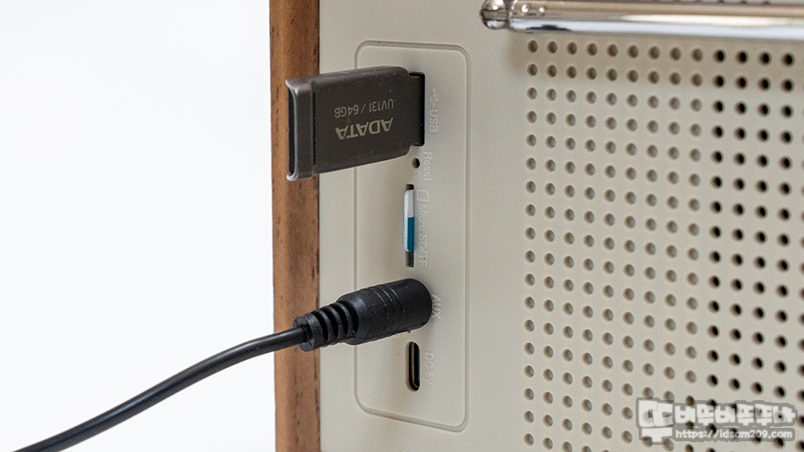 제품 후면에는 텔레스코픽 라디오 안테나와 USB/MircoSD/AUX 등 입력단자와 USB-C 충전단자 및 LED 인디케이터로 구성된 I/O로 구성되어 엔티크 느낌의 외형과 다르게 올인원 디지털 기기로 활용도가 좋은 편입니다.