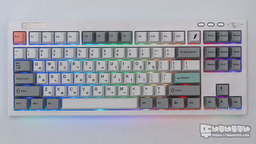 1stPlyaer NEO87는 깔끔하고 심플한 디자인, 투톤 느낌의 PBT 한영 이중사출 키캡, 정방향의 스위치가 적용된 은은한 RGB LED 효과 등 키보드 기본기가 잘 갖춰진 제품으로 다양한 흡음재와 팩토리 윤활 스위치가 사용되어 정숙하며 안정적인 타이핑이 가능하기에 데스크 테리어에 적합한 제품을 키보드를 찾으시는 분들에 좋은 제품이 될 거 같고요.
