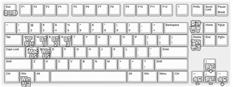 F8 재생 / 일시 정지 /  F9 다음 트랙 /  F10 음소거 /  F11 볼륨 작게 /  F12 볼륨 크게로 설정된 F 펑션열 기능과 위의 이미지의 정보와 같이 공장 초기화, 무선 연결 선택, OS 선택, RGB 효과 및 컬러 변경, 밝기 및 속도 조절까지 기본 설정이 되어 있으며 소프트웨어를 통해 나만의 FN 조합키 설정이 가능합니다.