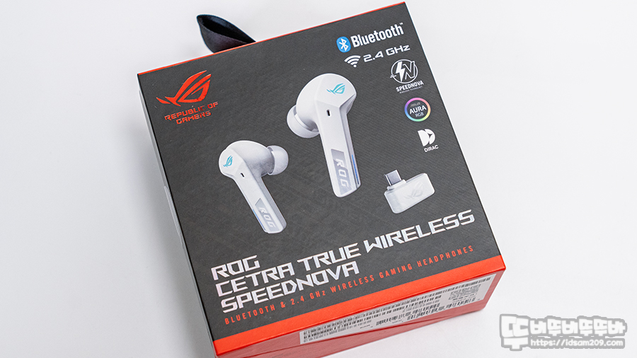 ROG CETRA TWS SPEEDNOVA는 강렬한 레드 & 블랙 컬러가 적용된 패키지로 Bluetooth 5.3 + 2.4GHz SPEEDNOVA 듀얼 무선, AURA RGB, DIRAC 기술 적용 등이 강조되고 있습니다.
