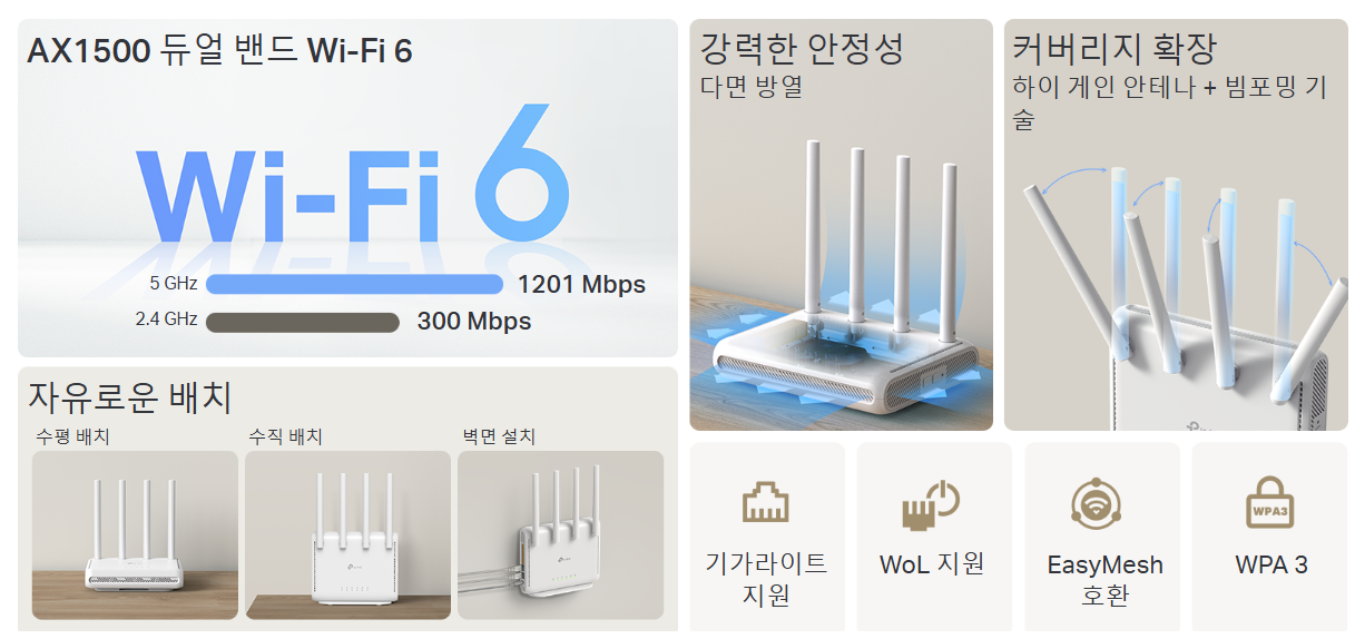 티피링크 Archer AX1500는 듀얼 밴드 Wi-Fi 6 (최대 1.5 Gbps 속도): 5 GHz 대역에서 1,201 Mbps, 2.4 GHz에서 300 Mbps 속도를 지원하며 2.4GHz와 5GHz 대역을 동시에 커버하는 고성능 듀얼 밴드 안테나는 4개로 구성되어 안정적인 Wi-Fi 6 속도를 지원합니다.