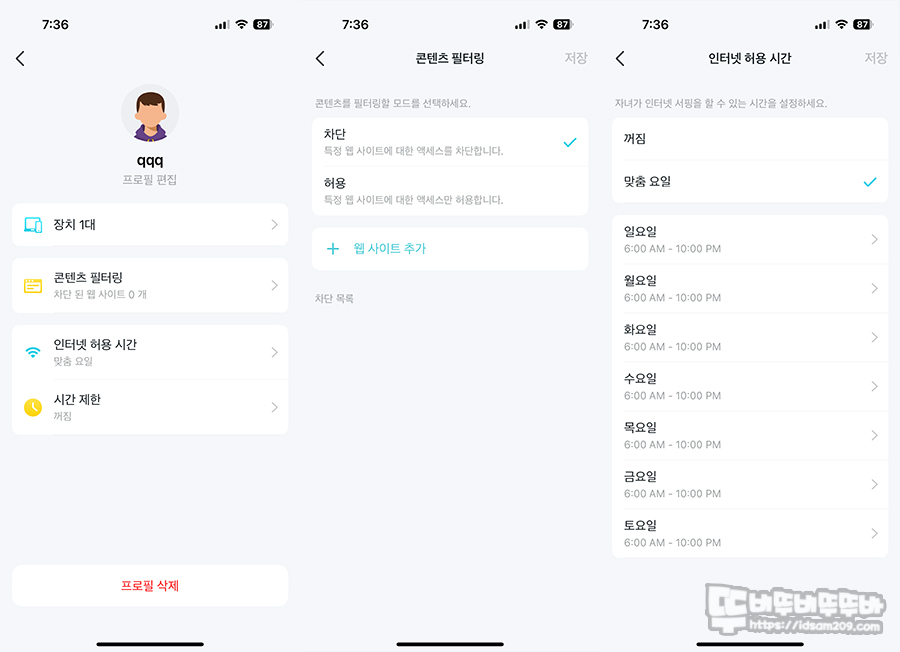 웹 브라우저를 이용한 설정에서 사용이 가능하지만 자녀보호 기능은 Tether 앱에서 정말 편리하게 설정할 수 있는데 프로필 등록 - 제한할 기기 선택 - 콘텐츠/인터넷 허용/인터넷 사용시간 등 다양한 설정으로 사용을 제한할 수 있습니다.