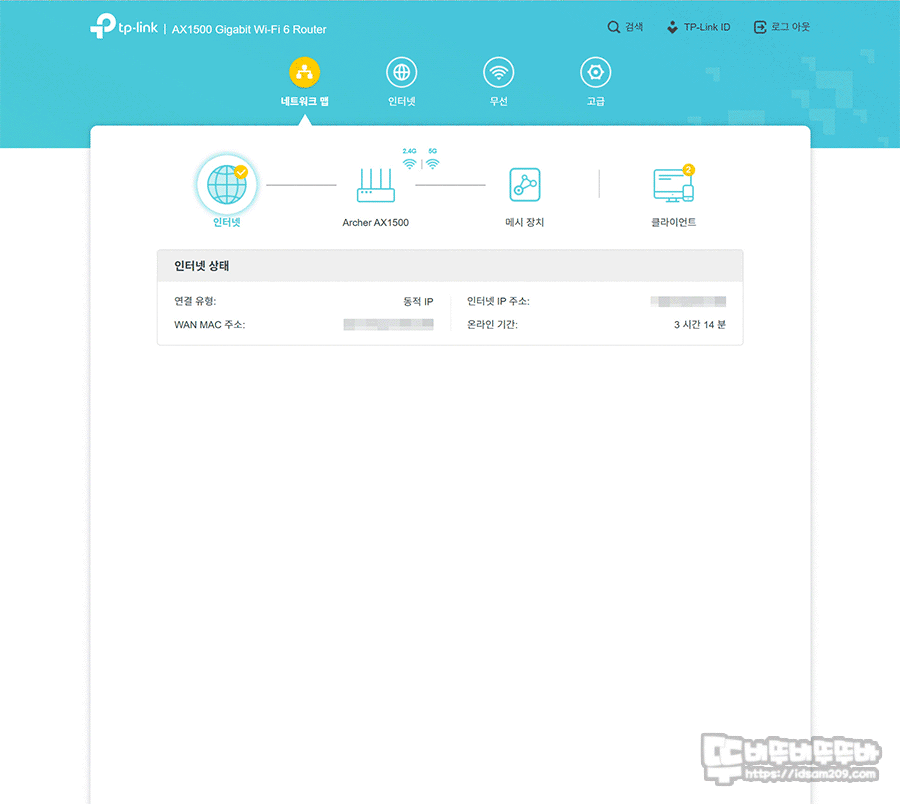 관리자 메뉴의 구성은 모니터링 성격의 네트워크 맵 / 인터넷 / 무선 메뉴와 세부 설정이 가능한 고급 메뉴로 구성되어 있어 기능 선택이 가능하며 무선의 경우 SSID/비밀번호 변경을 비롯한 무선 관련 옵션을 선택할 수 있게 구성되어 있습니다.