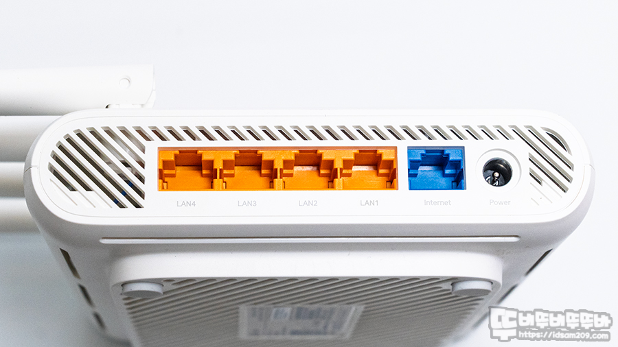 제품의 랜 포트 구성을 살펴보면 통신사 케이블이 연결되는 WAN 포트는 블루 컬러, 4개의 LAN포트는 오렌지 컬러, DC 12V/1A 전원 소켓으로 구성되어 있으며 모든 포트는 기가비트 속도를 지원하기에 500Mbps, 1Gbps 인터넷 서비스를 사용하시는 분들에게 적합하고요.