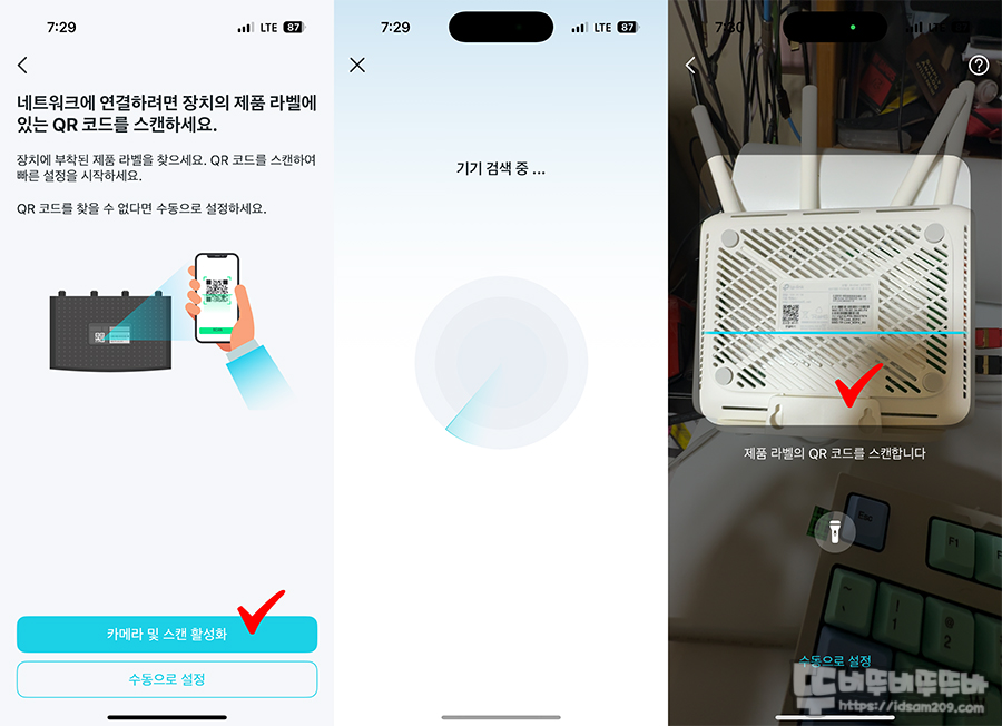 설정 진행 중 QR코드 스캔하는 과정에서는 공유기 바닥면에 QR 코드를 카메라로 비추면 자동으로 스캔하여 작업을 이어갑니다.