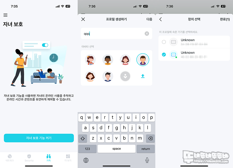 웹 브라우저를 이용한 설정에서 사용이 가능하지만 자녀보호 기능은 Tether 앱에서 정말 편리하게 설정할 수 있는데 프로필 등록 - 제한할 기기 선택 - 콘텐츠/인터넷 허용/인터넷 사용시간 등 다양한 설정으로 사용을 제한할 수 있습니다.