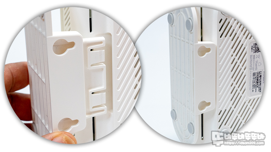 안테나 반대편에는 수직 브라켓을 결합할 수 있는 홈이 있으며 브라켓 바닥면에는 미끄럼 방지 패드가 부착되어 있어 안정적인 거치를 도와줍니다.