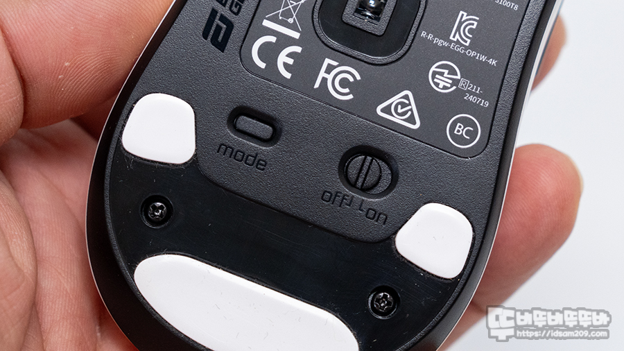 바닥면에 전원 스위치와 DPI를 변경할 수 있는 Mode 버튼 그리고 상판을 분리할 수 있게 노출된 나사를 확인할 수 있습니다.