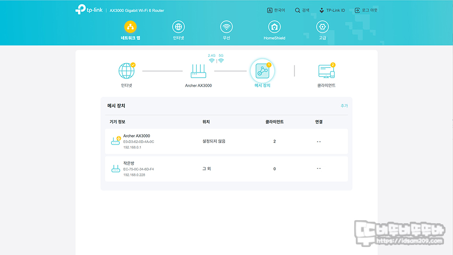 네트워크 맵 - 메시 장치의 경우 메시 구성이 되었을 때 메인과 위성(새틀라이트) 공유기의 연결 상태를 간략하게 보여주고요.