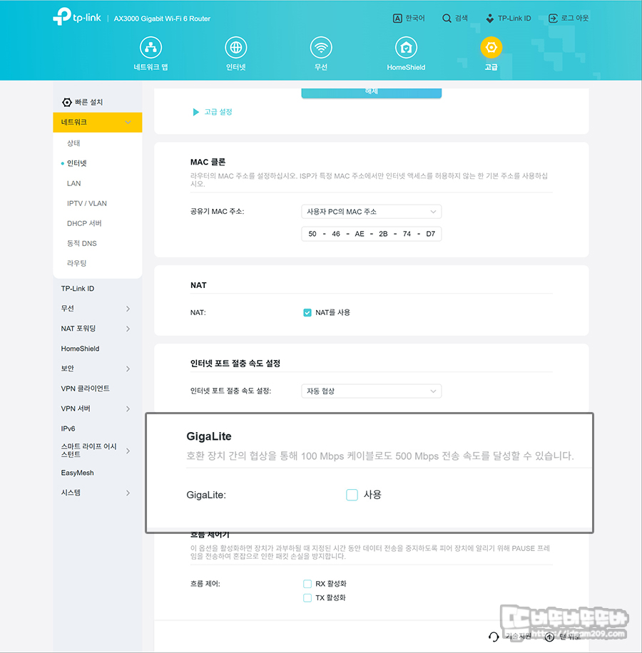 인터넷 항목에서는 기가슬림 서비스를 사용하는 유저들에게 도움이 되는 기능으로 통신사 공유기를 통하지 않고 기가슬림 서비스를 사용할 수 있는 GigaLite 메뉴가 있지만 통신사 특성에 따라 지원 여부가 다를 수 있으니 참고하시기 바랍니다.