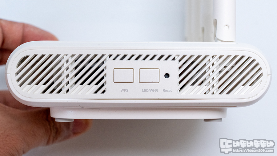 측면에는 WPS 버튼과 LED & Wi-Fi On/Off 버튼 그리고 리셋 버튼으로 구성되어 있으며 Wi-Fi On/Off 기능의 경우 2초 이하로 짧게 누르면 LED On/Off, 2초 이상 길게 누르면 Wi-Fi On/Off 설정이 가능하여 편리하게 사용할 수 있습니다.