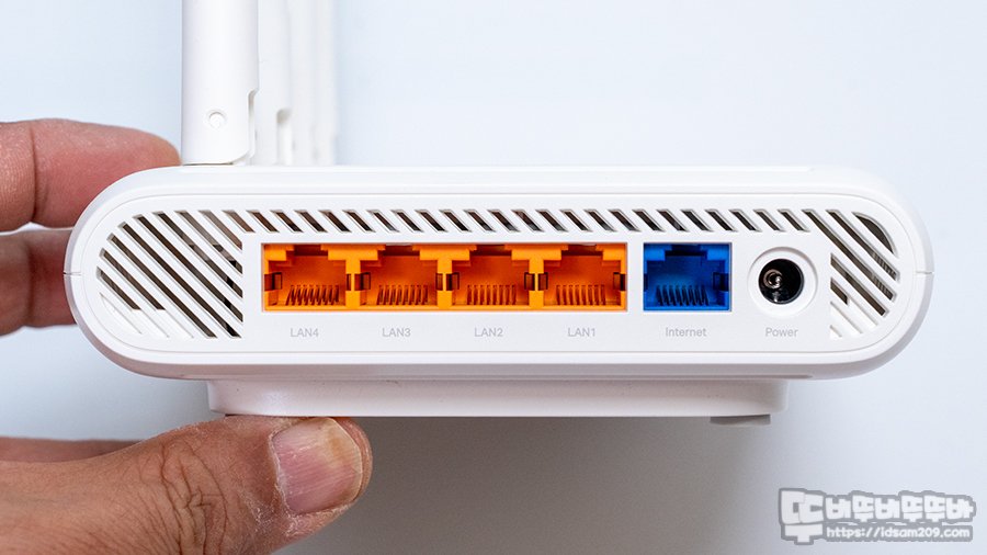 제품의 랜 포트 구성을 살펴보면 통신사 케이블이 연결되는 WAN 포트는 블루 컬러, 4개의 LAN포트는 오렌지 컬러, DC 12V/1A 전원 소켓으로 구성되어 있으며 모든 포트는 기가비트 속도를 지원하기에 500Mbps, 1Gbps 인터넷 서비스를 사용하시는 분들에게 적합하고요.