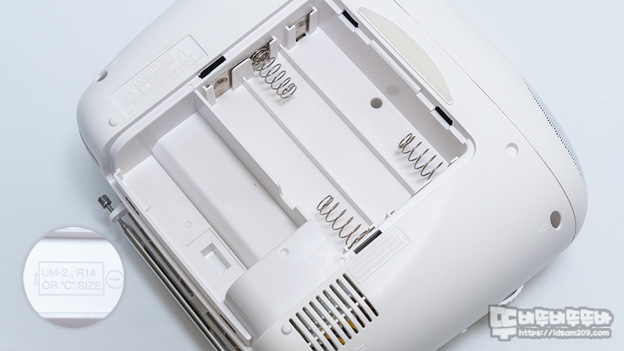 커버를 오픈하면 C 타입 (UM-2, R14) 건전지 6개를 사용할 수 있게 구성되어 있으며 사용하는 환경에 따라 다르겠지만 알카라인 건전지 기준이로 약 4~8시간으로 추측됩니다.