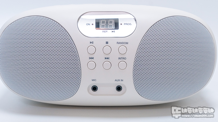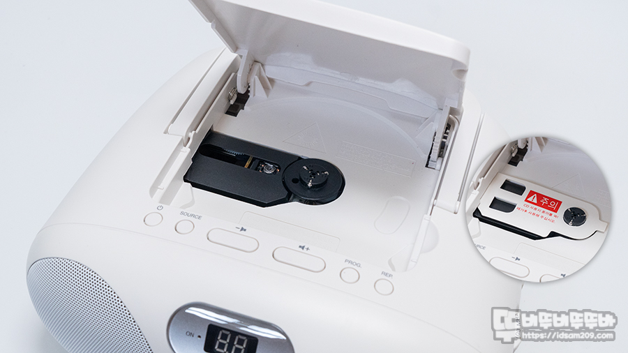 CD 덮개는 오른쪽 측면에 홈을 이용하여 기계적인 조작 없이 손으로 직접 열고 닫는 방식이며 플레이어 상단에는 전원 / 입력 소스 / 볼륨 / 프로그램 설정 / 반복 버튼 그리고 제품 전면에는 LED 디스플레이와 LED 인디케이터, 재생/일시 정지, 멈춤, 랜덤 재생, 트랙 이동, 인트로 버튼, 마이크 입력 및 AUX 입력 버튼으로 구성되어 있습니다.