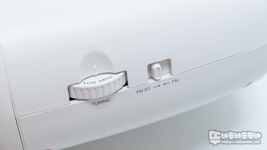 우측 측면에는 FM 주파수 채널이 인쇄된 아날로그 다이얼과 FM 스테레오 또는 모노 청취가 가능한 선택 버튼을 확인할 수 있고요.