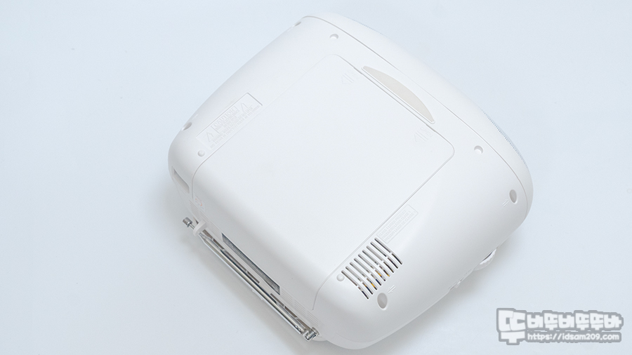 제품 뒷면에는 FM 라디오 안테나 그리고 220V AC 소켓 그리고 바닥면에는 건전지를 장착할 수 있는 커버 모습이 보입니다.