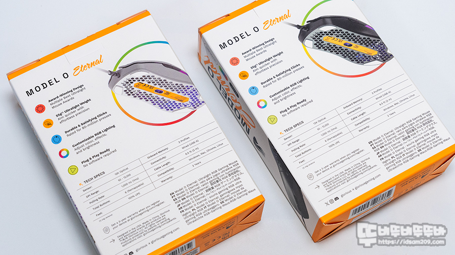 MODEL O ETERNAL 패키지는 기존의 두툼함과 거리가 있는 슬림하면서 가벼운 느낌을 주며 전면 인쇄 내용에서는 제품 컬러에 맞는 제품 이미지와 55g의 가벼운 무게 그리고 제품의 컬러 정보를 확인할 수 있습니다.